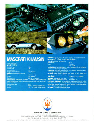 ![]() KHAMSIN - 4 page brochure Produced by Maserati Automobiles Incorporated (U.S.) |